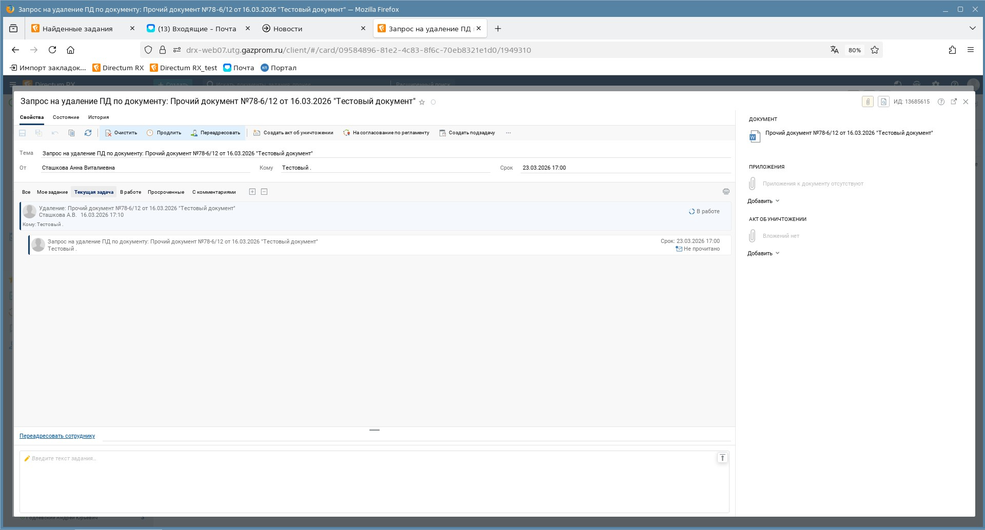 В карточке задания автор проверяет корректность и полноту заполнения Акта, наличие выгрузки из журнала регистрации событий в Directum RX, использует кнопку «Сформировать акт об уничтожении» и направляет Акт на согласование членам экспертной комиссии по кнопке «На согласование по регламенту».
