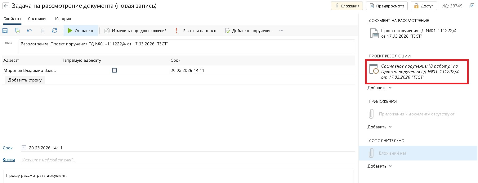 Автор документа формирует проект и отправляет его на рассмотрение руководителю. При этом автоматически создается проект поручения и прикладывается к задаче.