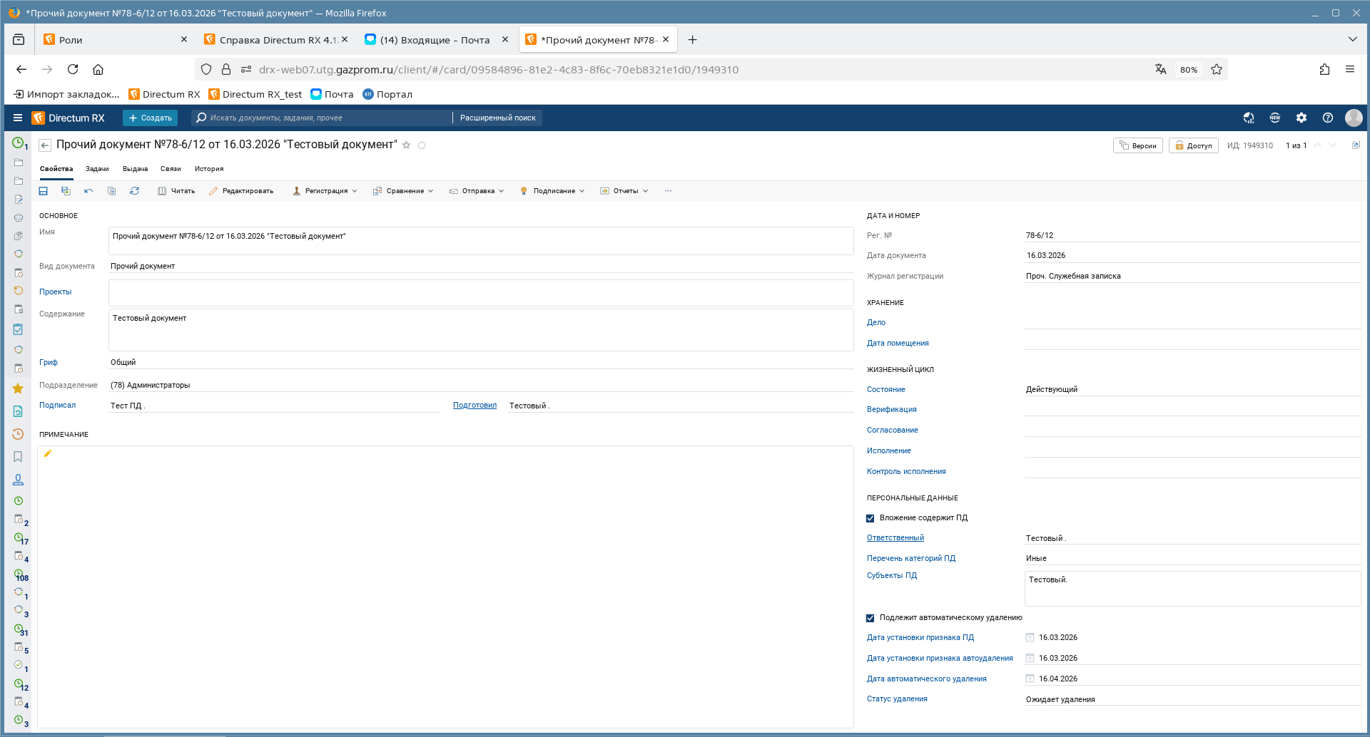 Во всех остальных случаях документы, содержащие персональные данные, подлежат удалению в Directum RX по достижении цели обработки ПД — по истечении 30 календарных дней с момента завершения всех задач по рассмотрению и исполнению документа.