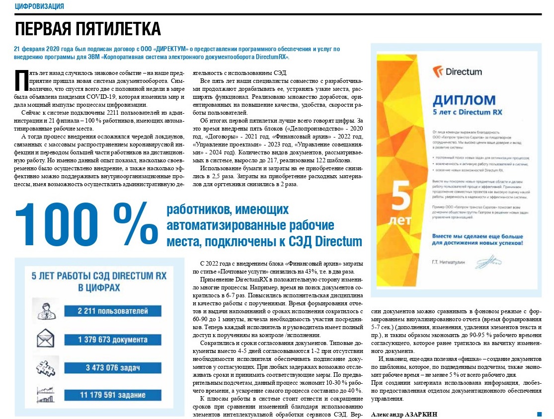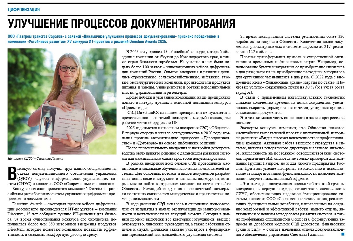 ООО «Газпром трансгаз Саратов» активно делится опытом по использованию системы и регулярно принимает участие в конкурсе Directum Awards:
