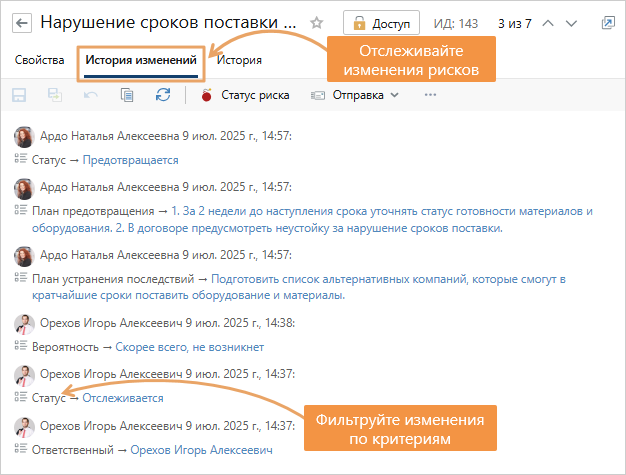 История изменений рисков. В новой версии можно быстро посмотреть, кто, когда и какие изменения вносил в карточку риска: