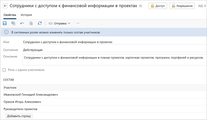 Теперь настройка доступа к информации о затратах по проекту стала гибче. В новой версии решения появилась предопределенная роль «Сотрудники с доступом к финансовой информации в проектах». Администратор может добавить в нее отдельных сотрудников, роли или подразделения, которые должны иметь доступ к данным о затратах: