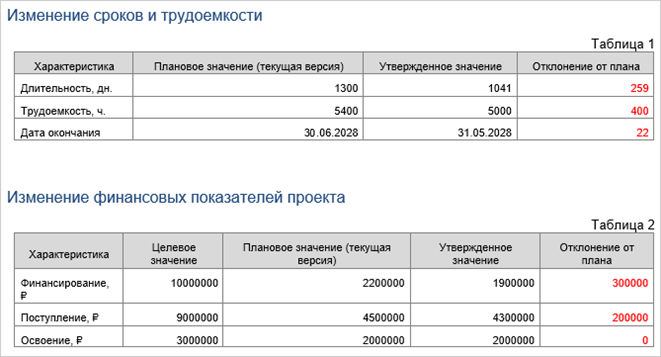 В документе отображается, какие показатели проекта были утверждены и каковы их плановые значения на текущий момент: