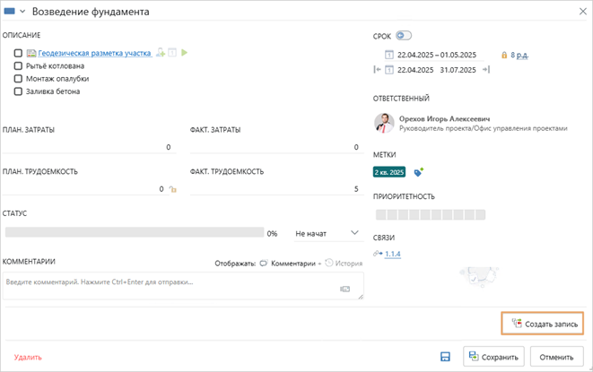 Разработчик может адаптировать элементы плана под потребности организации. Теперь в карточки элементов плана кроме свойств можно добавлять действия. Допустим, в ходе внутренней экспертизы строительного объекта замечания должны фиксироваться и нумероваться в журнале регистрации. Чтобы сократить количество кликов, разработчик может добавить в этап действие, с помощью которого в журнале регистрации автоматически создается запись с заполненными данными: