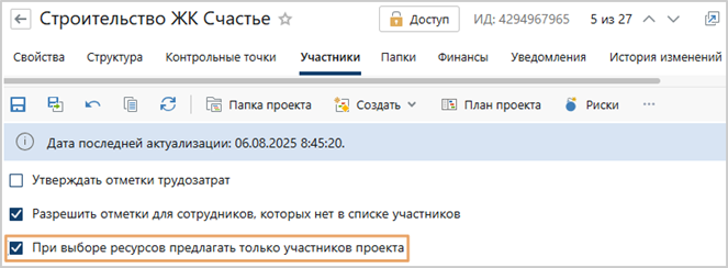 Назначение ресурсов из списка участников. Раньше при назначении ресурсов и ответственных выполнялся поиск по всем сотрудникам. Теперь его можно ограничить только участниками проекта. Это ускоряет выбор ресурсов руководителем. Чтобы в списке сотрудников отображались только участники проекта, достаточно на вкладке «Участники» установить соответствующий флажок: