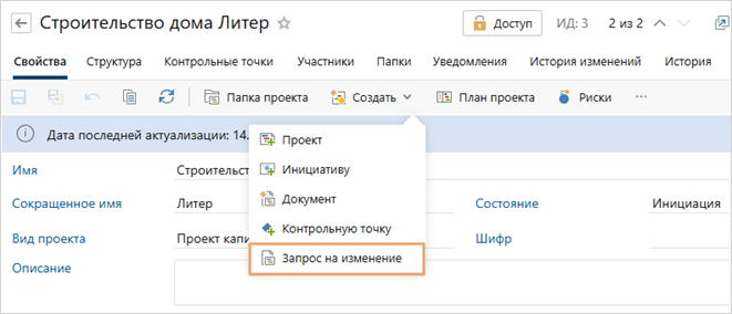 После утверждения плана могут измениться ключевые характеристики проекта, например сроки или затраты. В этом случае руководителю нужно согласовать изменения с заинтересованными лицами и заказчиком. Чтобы автоматизировать этот процесс, в новой версии добавили вид документов «Запрос на изменение проекта». Запрос создается на основе шаблона с автозаполняемыми полями прямо из карточки проекта: