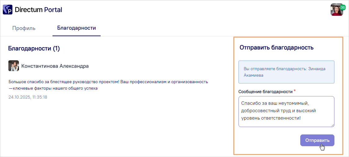 Благодарности отправляются через свой профиль или профиль коллеги. Нужно только заполнить специальную форму, написав добрые слова, а затем нажать на кнопку отправки: