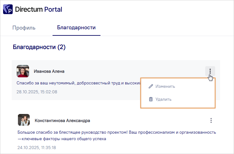 На портале теперь можно публично благодарить коллег. Для этого администратор добавляет в их профили виджет «Благодарности». С его помощью легко отметить вклад в общее дело, выразить признание за помощь или осветить успешно завершенный проект. Это укрепляет рабочие связи в коллективе, формирует культуру взаимной поддержки и мотивирует сотрудников: