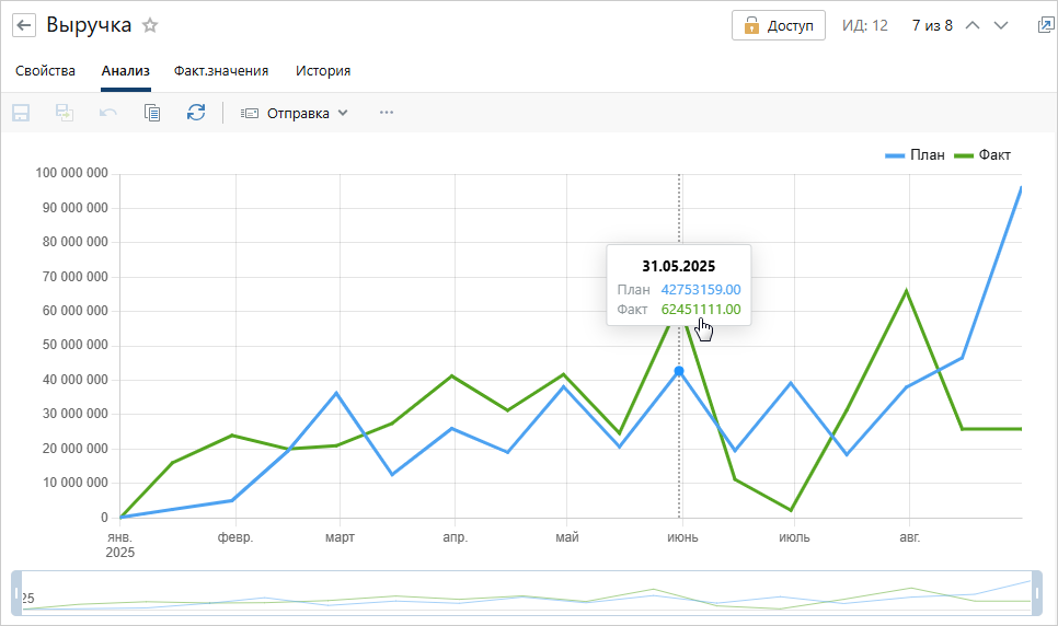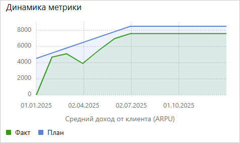 В нем отображается динамика плановых и фактических значений метрики. При необходимости можно посмотреть подробную информацию о состоянии метрики на определенную дату, наведя курсор мыши на график.