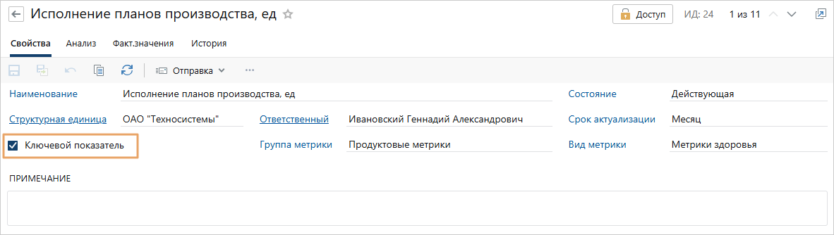 Кроме того, в новой версии стало проще отслеживать метрики, не связанные со стратегическими целями компании. Например, когда параллельно с целями контролируют показатели работы отдела, такие как план производства. Теперь контролировать эти показатели можно напрямую в карте целей. Для этого достаточно назначить их ключевыми для структурной единицы: