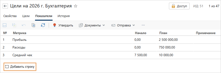 Ключевые метрики автоматически добавляются в основную карту целей структурной единицы на вкладку «Показатели». При необходимости можно вручную дополнить список показателей по кнопке Добавить строку. Благодаря этому появилась возможность отслеживать все цели и метрики в одном окне: