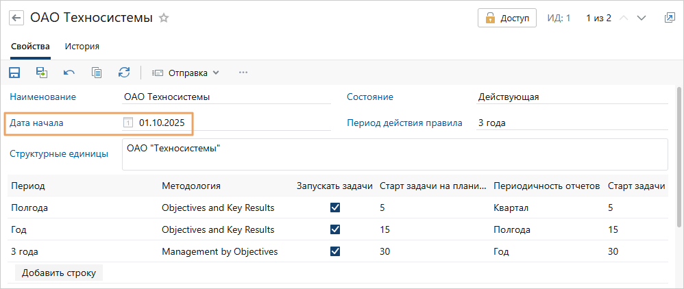 В зависимости от этой даты и периодов планирования, указанных в правиле, рассчитываются периоды целей. Например, при дате начала правила 01.10.2025 трехгодовые цели ставятся на период с 01.10.2025 по 30.09.2028. Благодаря этому руководители своевременно получают задания на постановку целей, добавление промежуточных статусов и подведение итогов работ.