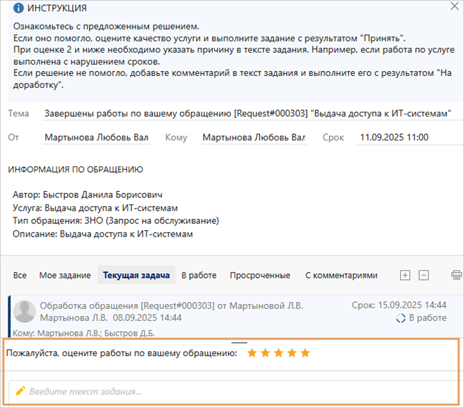 При приемке результатов обращения сотрудники могут оценивать качество выполненных работ: