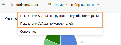 В новой версии появились наборы виджетов, которые соответствуют роли сотрудника в компании. Благодаря этому каждый видит ту информацию, которая нужна для его работы. Например, руководители могут посмотреть исполнительскую дисциплину по всему отделу, а сотрудники службы поддержки — свои личные показатели. Выбрать подходящий набор можно в выпадающем списке Применить набор виджетов: