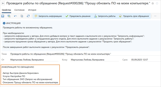 В задании на выполнение обращения теперь отображается краткая сводка. Например, в ней есть описание, автор и услуга. Это позволяет сотруднику службы поддержки быстро ознакомиться с ключевой информацией, не открывая карточку обращения: