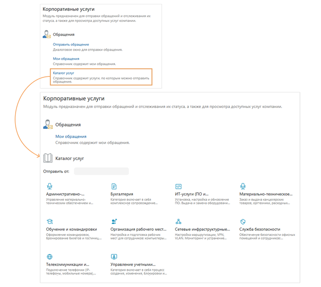 Теперь категории услуг на обложке модуля отображаются в виде плиток. Это упрощает навигацию и ускоряет поиск даже при большом количестве вариантов. Администраторы настраивают порядок отображения категорий и могут разместить на первом плане наиболее востребованные услуги:
