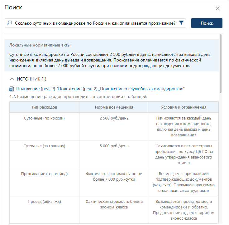 Улучшенный вопросно-ответный поиск в таблицах. Чтобы пользователи получали более точные и полные ответы на запросы, вопросно-ответный поиск стал лучше анализировать информацию в документах с таблицами. Например, в отчетах со структурированными данными в форматах DOCX, MD и RXMD. Теперь при формировании ответов учитываются структура таблиц, связи между заголовками, строками и значениями.