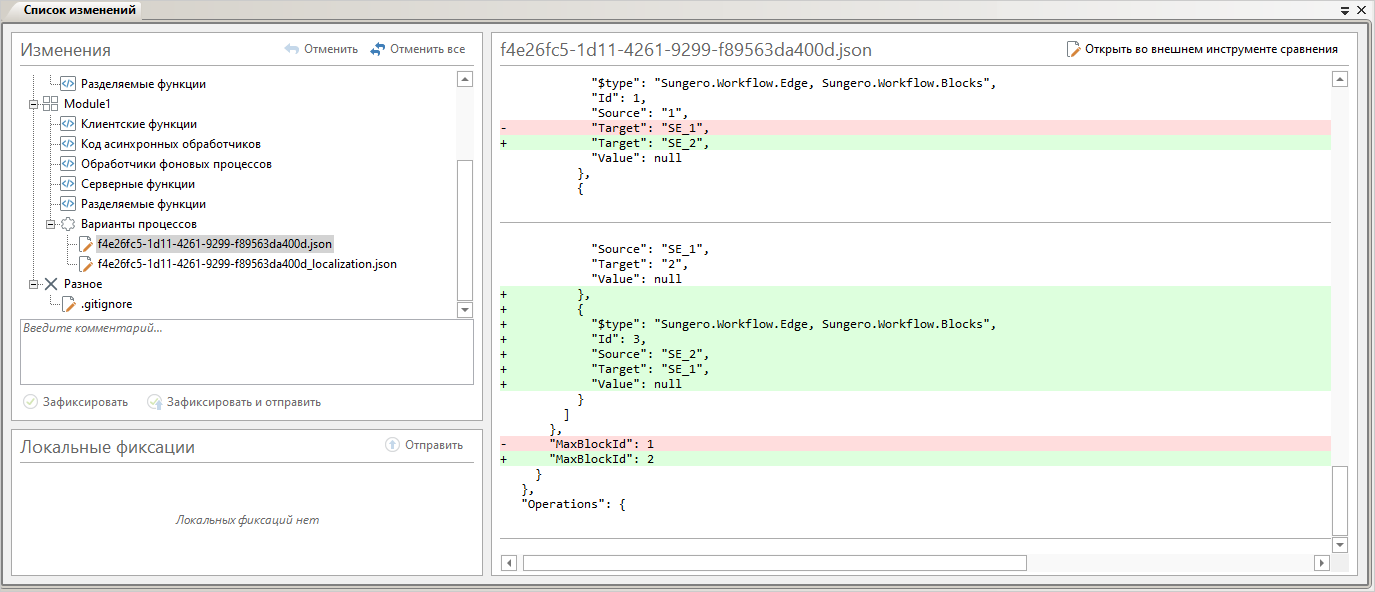 Наглядное отображение изменений вариантов процессов. В среде разработки на вкладке «Список изменений» теперь наглядно отображается, что изменилось: вид схемы, свойства блоков и т.д. Чтобы разработчику было удобнее анализировать изменения вариантов процессов, их настройки показаны отдельными строками в формате JSON: