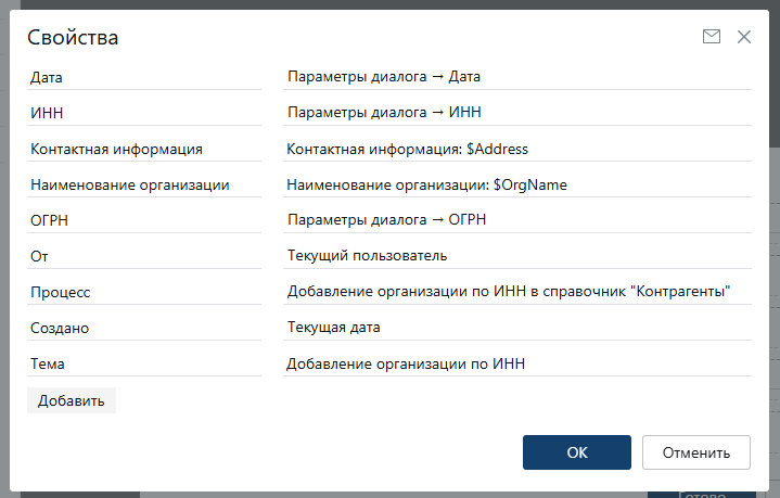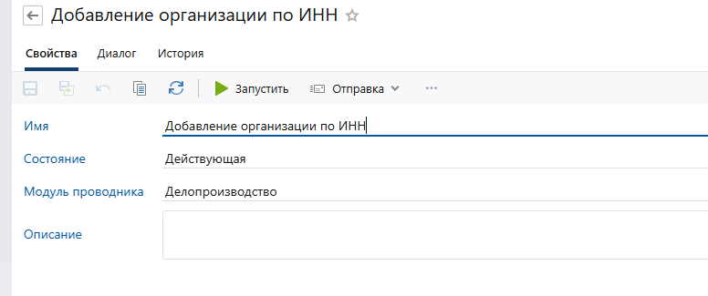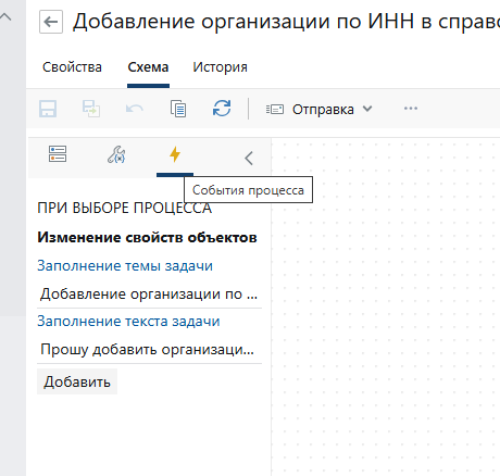 С конфигурацией диалога закончили. Теперь немного поправим схему процесса задачи, которая была создана отдельно (пример выше). Откроем нашу карточку бизнес-процесса и в событиях процесса внесем изменения текста формируемой задачи, чтобы сотрудник, который получит задачу на добавление организации в справочник, увидел данные, с которыми нужно выполнить действия.