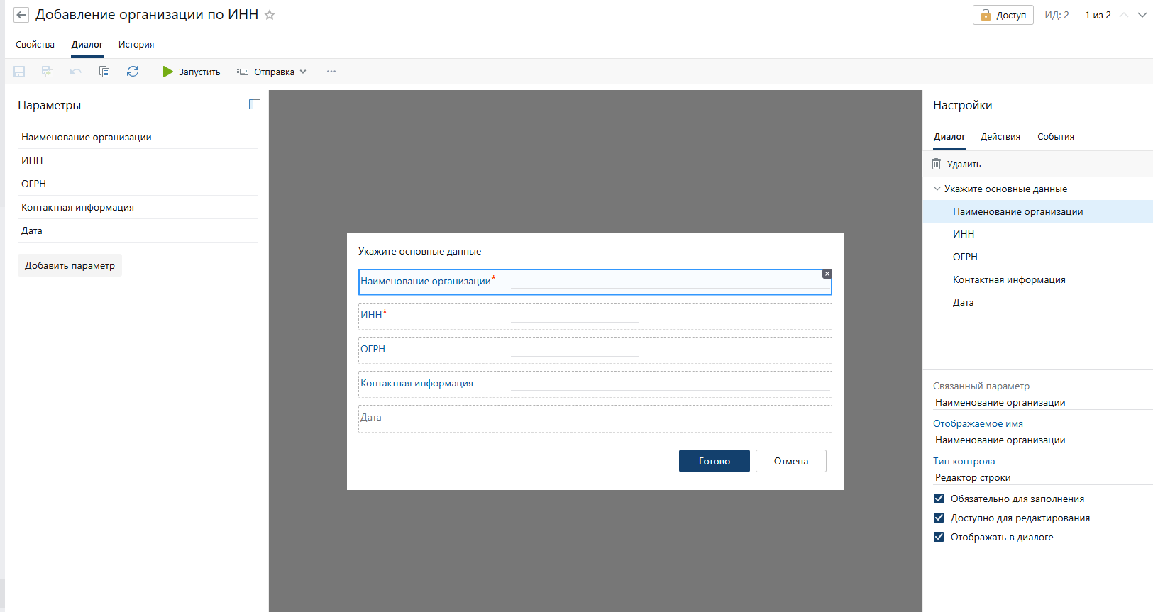 3. Конфигурируем диалог. Перейдем на вкладку "Диалог" и заполним сначала параметры, т.е. сущности, которые были созданы, а справа добавим контролы(проще говоря поля ввода), которые и будут формировать внешний вид диалога. Причем у каждого поля можно указать дополнительные свойства.(обязательное, редактируемое или нет и отображать ли данное поле в диалоге).