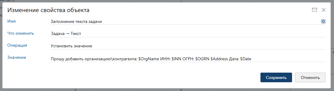5. Зададим свойства задачи. Как Вы видите на скриншоте, в свойствах указаны параметры сущностей, которые дальше тоже будем использовать для формирования текста задачи.