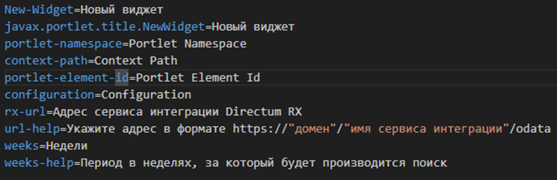 В файле локализации задаются ключи и их локализованное значение. Используется для локализации текста конфигурации, а также при необходимости текста, отображаемого в виджете для клиента. Для русской локализации нужно создать файл с наименованием Language_ru_properties.