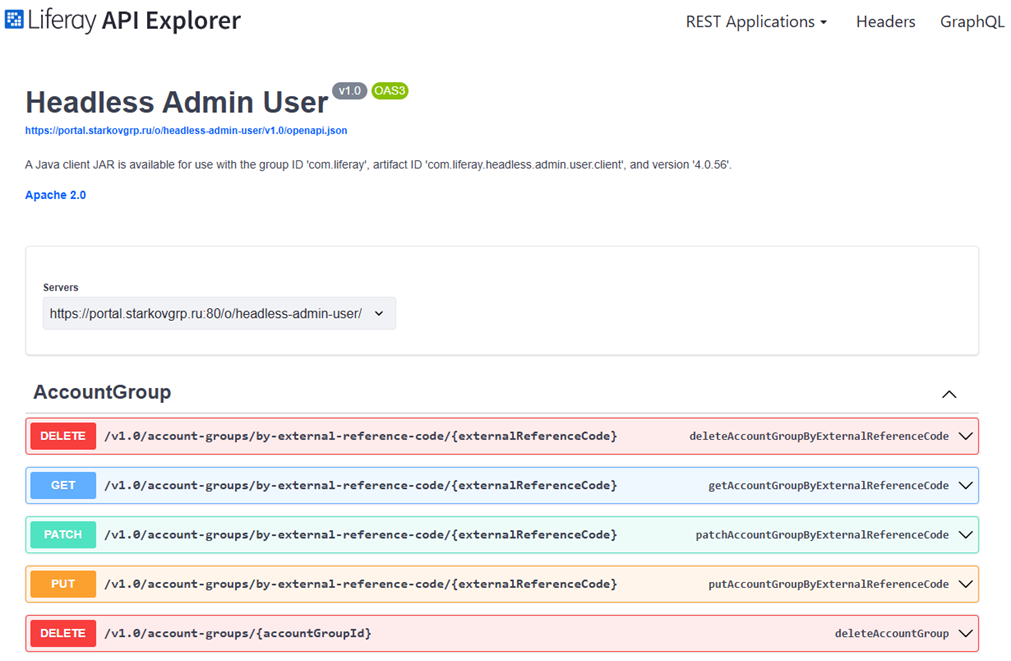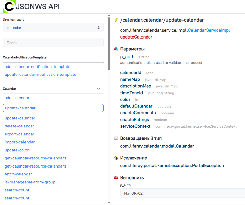 Доступен по адресу /api/jsonws, по которому откроется веб интерфейс с описанием методов.
