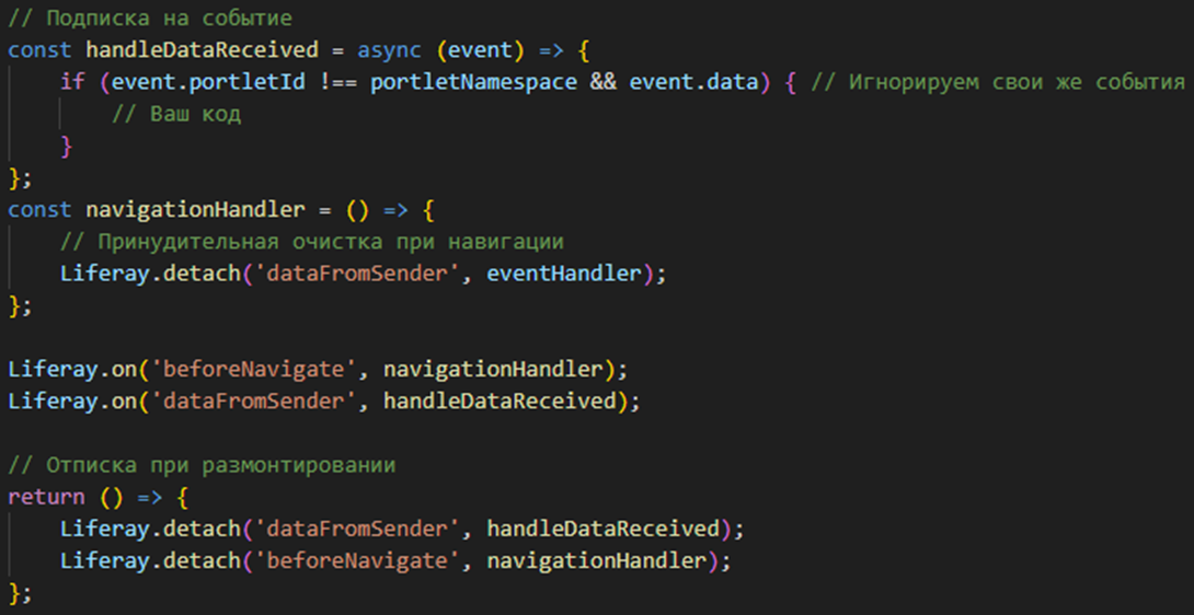 Допустим у нас есть несколько виджетов которые должны обмениваться данными между собой. Для таких случаев в Liferay есть система событий. Liferay.fire позволяет отправлять данные в виде объекта. А Liferay.on работает как подписка на события, с заданным наименованием. Важно при переключении страниц удалять подписки на события, для этого используется метод Liferay.detach.