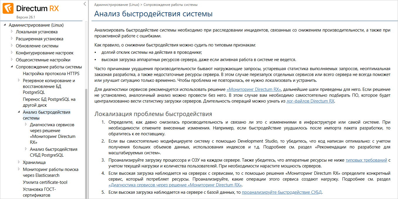 В справке Directum RX 25.3 добавлен раздел «Анализ быстродействия системы» (Linux, Windows). Во вводной части приведен общий механизм локализации проблемы.