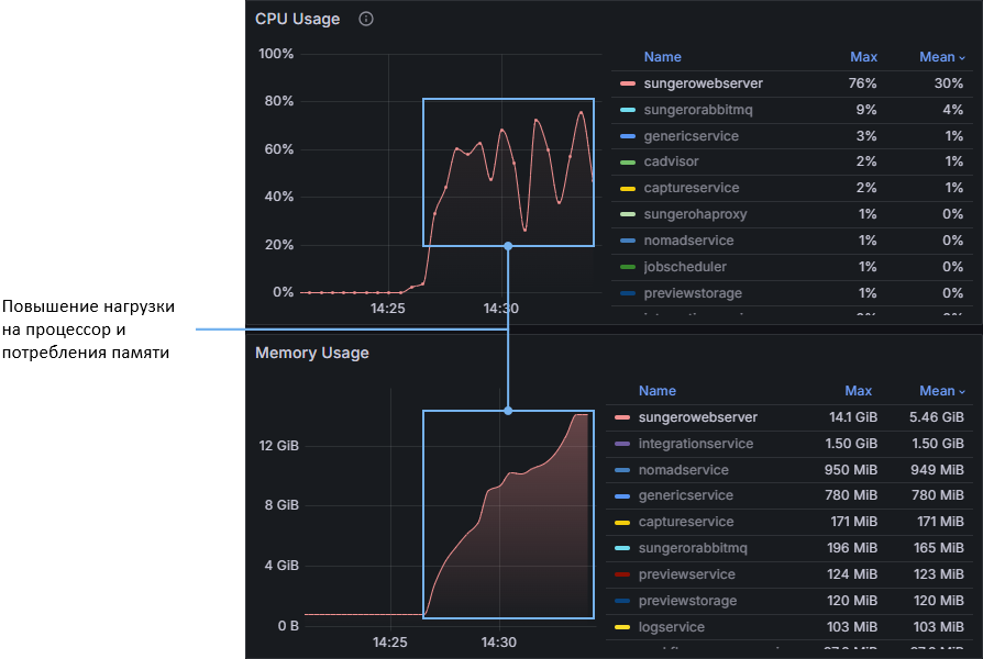 Далее рассмотрена диагностика сервисов через решение «Мониторинг Directum RX». Пошагово рассказано, как по дашбордам определить повышение нагрузки и нагружающие операции.