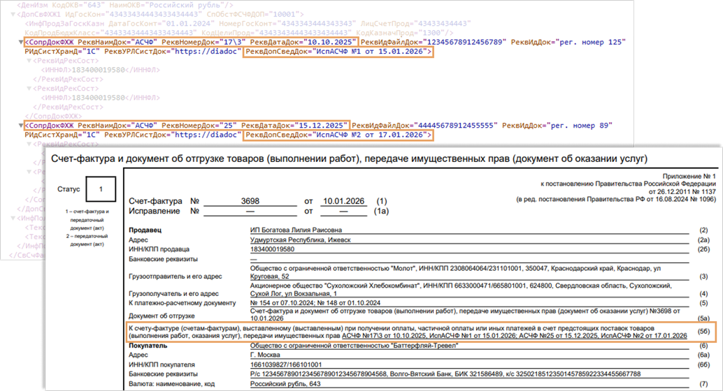 В печатной форме УПД формата 5.03 с функциями «СЧФ» и «СЧФДОП» и датами документов начиная с 01.01.2026 добавлена строка «5б». В ней отображаются наименование документа, его номер, дата и информация об исправлениях счета-фактуры, если они были: