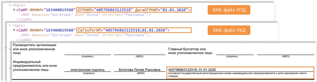 В печатных формах УПД и УКД отображалось поле, в котором можно было указать реквизиты свидетельства о государственной регистрации индивидуального предпринимателя. Теперь в этом поле визуализируются регистрационный номер ОГРНИП и дата его присвоения, если продавцом является индивидуальный предприниматель и данные указаны в XML-файле. Изменения внесены в печатные формы: