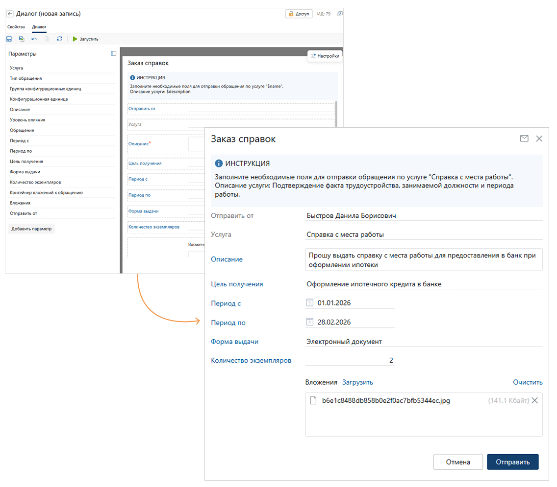 Теперь для каждой услуги администратор может настроить уникальную форму запроса данных. Набор полей задается в визуальном редакторе в справочнике Диалоги. В результате пользователи заполняют интуитивно понятные диалоги, а служба поддержки получает структурированные обращения. Это сокращает время на запрос информации и ускоряет решение вопросов.