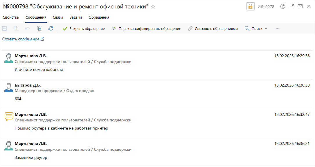 Теперь в переписке по обращению видно, в каком отделе работает автор сообщения и какую должность он занимает. Сообщения отображаются в виде диалога с понятными подписями и временем отправки: