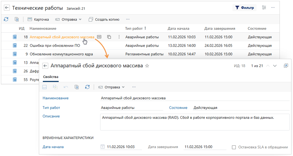 Раньше информация о регламентных или аварийных работах не отображалась для сотрудников. Из-за этого они могли отправлять обращения по временно недоступным услугам. В результате увеличивалась нагрузка на службу поддержки. В новой версии решения специалисты поддержки могут оперативно информировать коллег об ограничениях в работе услуг и конфигурационных единиц. Для этого создаются записи в справочнике Технические работы: