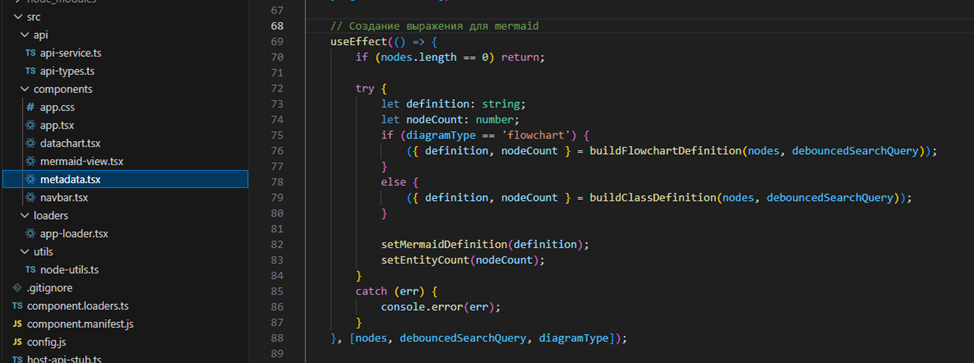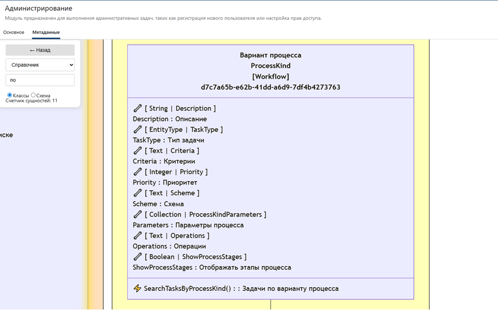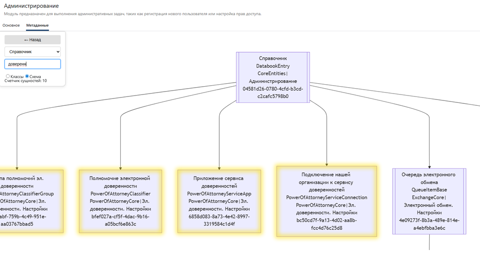 Решение представляет собой визуализацию схемы классов метаданных для удобного восприятия. В работе используется сервис интеграции и функции пространства имен Sungero.Metadata, сторонний компонент на React, а также библиотека Mermaid для отрисовки схем.