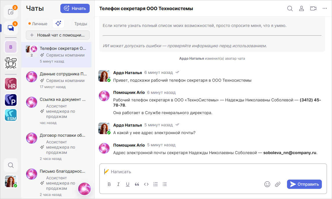 В новой версии расширены возможности роли «Сервисы компании». Раньше в этой роли помощник создавал обращение в поддержку, если использовалось решение «Корпоративные услуги». Теперь он научился подсказывать информацию об организации, ее сотрудниках, контрагентах и их контактных лицах. Например, это полезно, когда нужно узнать ФИО руководителя организации-контрагента или телефон коллеги: