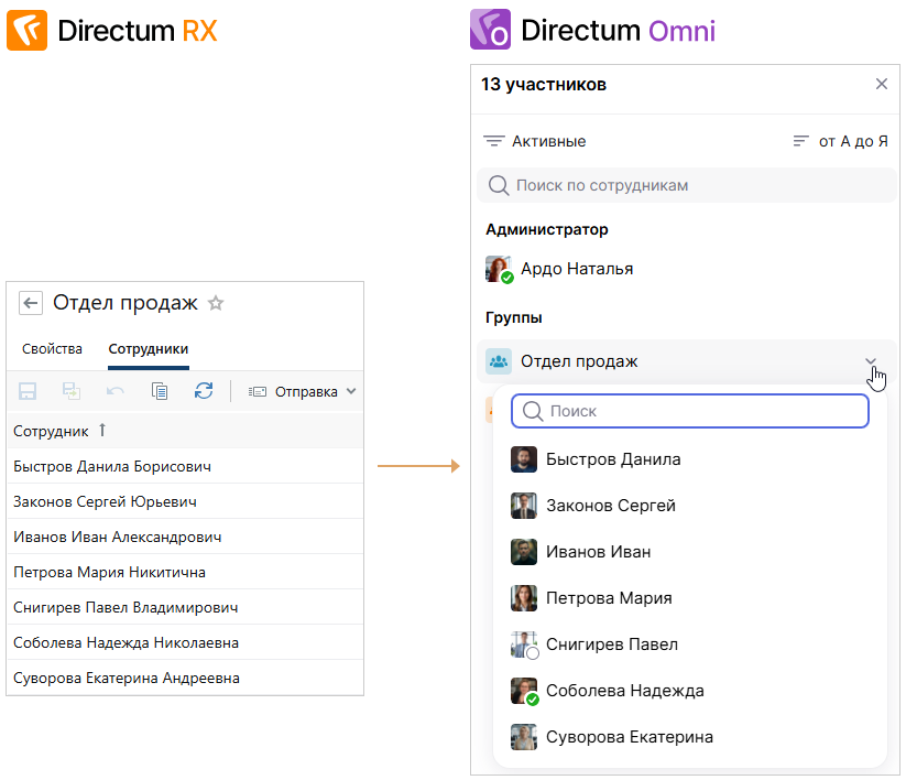 Когда состав подразделения меняется в Directum RX, эта информация передается в Directum Omni, и список участников чата обновляется. Например, если сотрудник перевелся из отдела маркетинга в отдел продаж, он автоматически: