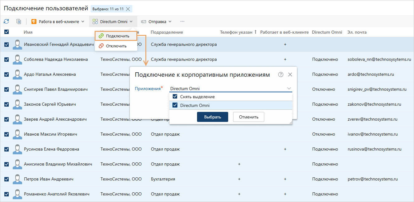 Учетные записи для таких сотрудников формируются автоматически при подключении к Directum Omni, если в карточке сотрудника снят флажок Работает в веб-клиенте.