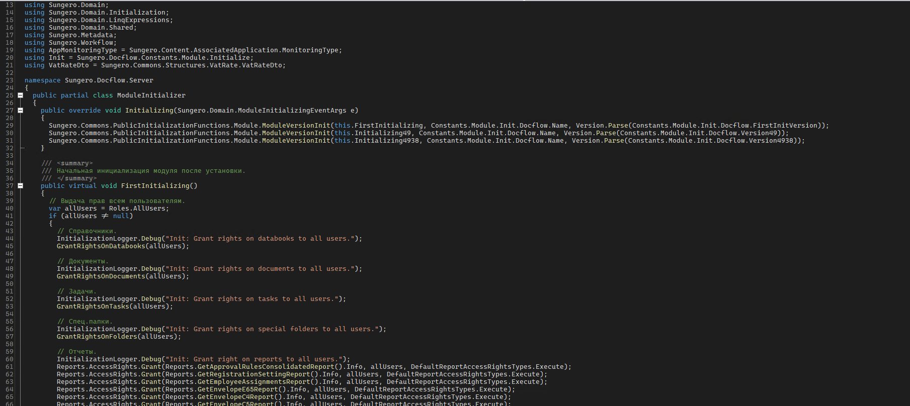 Тёмная цветовая схема для редактора кода очень частое явление среди разработчиков. Многим IBSL разработчикам пришлось долго ждать появления приятных глазу цветовых сочетаний. С DirectumRX скорее всего будет аналогичная ситуация. Но здесь дело обстоит проще, так как Sungero Development Studio (далее SDS) использует проект SharpDevelop, что позволяет произвести кастомизацию при помощи настроек параметров подсветки текстового редактора, это является достаточно трудоёмким занятием, если под рукой нет цветового набора подробной расцветки с обозначением цветов в виде номера в шестнадцатеричном виде.
